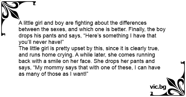 A little girl and boy are fighting about the differences between the sexes, and which one is better. Finally, the boy drops his pants and says, “Here’s something I have that you’ll never have!”