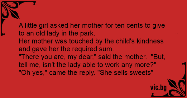 A little girl asked her mother for ten cents to give to an old lady in the park.