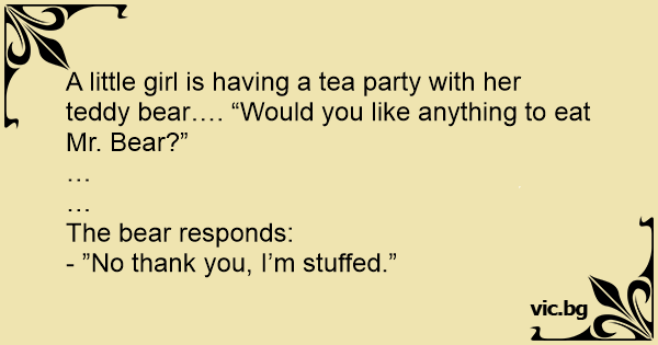 A little girl is having a tea party with her teddy bear…. “Would you like anything to eat Mr. Bear?”