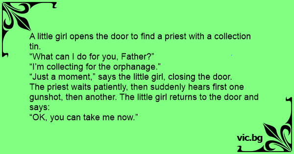 The priest waits patiently, then suddenly hears first one gunshot, then another. The little girl returns to the door and says: