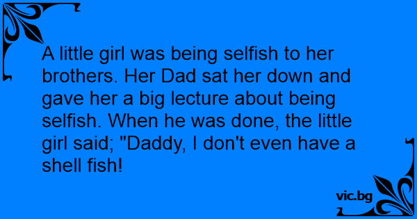 A little girl was being selfish to her brothers. Her Dad sat her down and gave her a big lecture about being selfish. When he was done, the little girl said; "Daddy, I don't even have a shell fish!