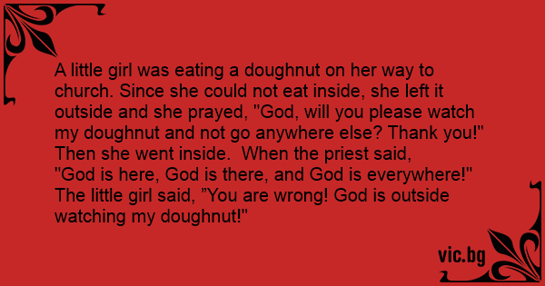 A little girl was eating a doughnut on her way to church. Since she could not eat inside, she left it outside and she prayed, "God, will you please watch my doughnut and not go anywhere else? Thank you!"