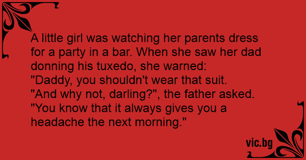 A little girl was watching her parents dress for a party in a bar. When she saw her dad donning his tuxedo, she warned: