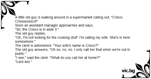 A little old guy is walking around in a supermarket calling out, "Crisco, Crisssssssco!"