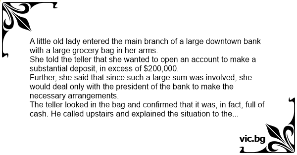 Дребничка възрастна госпожа влязла в Чейс Манхатън Банк и попитала дали може да си открие сметка.