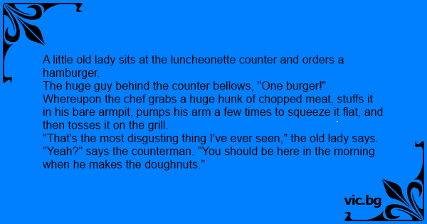 A little old lady sits at the luncheonette counter and orders a hamburger.