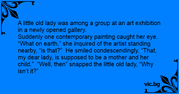 Suddenly one contemporary painting caught her eye. “What on earth,” she inquired of the artist standing nearby, “is that?” He smiled condescendingly. “That, my dear lady, is supposed to be a mother and her child.” “Well, then” snapped the little old lady, “Why isn’t it?”