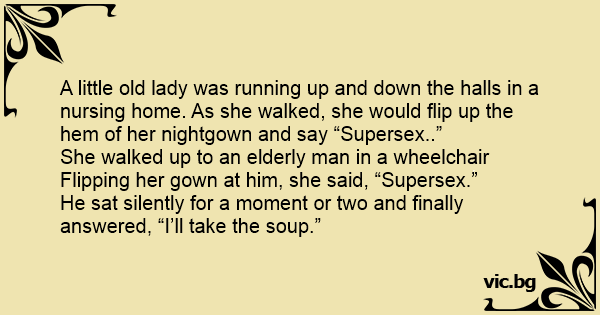 A little old lady was running up and down the halls in a nursing home. As she walked, she would flip up the hem of her nightgown and say “Supersex..”