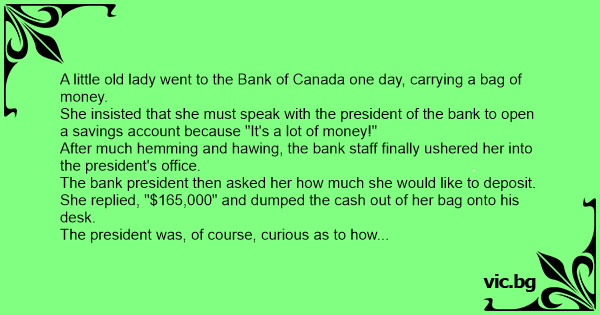 Egy idős kis hölgy egy nap bement a kanadai nemzeti bankba egy táskányi pénzzel. Ragaszkodott hozzá, hogy a bank elnökével kíván beszélni számlanyitással kapcsolatban, mondván: "Sok pénzről van...
