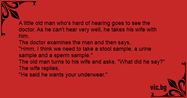Ett äldre par kommer in på sjukhuset och får träffa doktorn. Denne säger till mannen: - Du får lämna urinprov, avföringsprov och blodprov. Mannen stirrar på doktorn och säger: - Va sa du???...