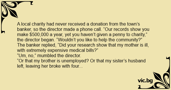 A local charity had never received a donation from the town’s banker, so the director made a phone call. “Our records show you make $500,000 a year, yet you haven’t given a penny to charity,” the director began. “Wouldn’t you like to help the community?”