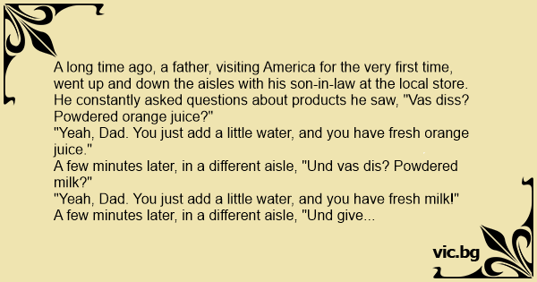 He constantly asked questions about products he saw, "Vas diss? Powdered orange juice?"