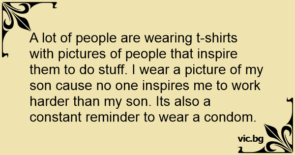 A lot of people are wearing t-shirts with pictures of people that inspire them to do stuff. I wear a picture of my son cause no one inspires me to work harder than my son. Its also a constant reminder to wear a соndом.