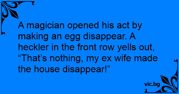 A magician opened his act by making an egg disappear. A heckler in the front row yells out, “That’s nothing, my ex wife made the house disappear!”