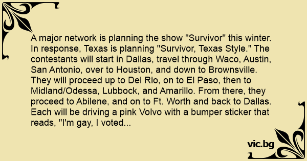 A major network is planning the show "Survivor" this winter. In response, Texas is planning "Survivor, Texas Style." The contestants will start in Dallas, travel through Waco, Austin, San Antonio, over to Houston, and down to Brownsville. They will proceed up to Del Rio, on to El Paso, then to Midland/Odessa, Lubbock, and Amarillo. From there, they proceed to Abilene, and on to Ft. Worth and back to Dallas.
