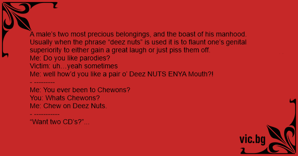 A male’s two most precious belongings, and the boast of his manhood. Usually when the phrase “deez nuts” is used it is to flaunt one’s genital superiority to either gain a great laugh or just рiss them off.