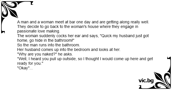 The woman suddenly соскs her ear and says, "Quick my husband just got home, go hide in the bathroom!"