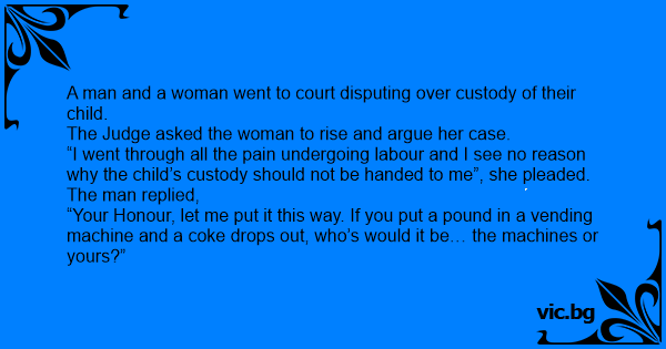 Маж и жена се разведуваат на суд и пред судијата се расправаат за старателството над детето. Жената му вели на судијата: - Јас го родив детето, во мојот стомак растеше и треба мене да ми припадни....