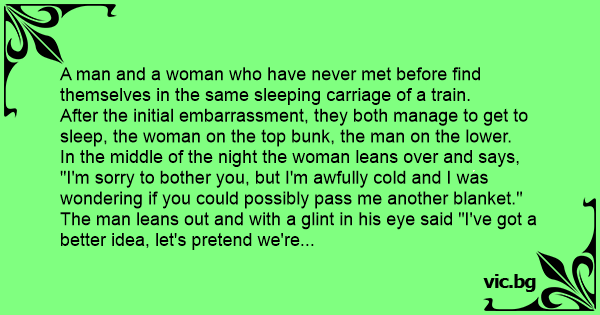 In the middle of the night the woman leans over and says, "I'm sorry to bother you, but I'm awfully cold and I was wondering if you could possibly pass me another blanket."