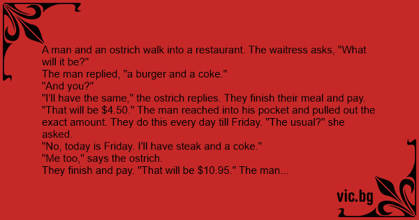 "I'll have the same," the ostrich replies. They finish their meal and pay.
