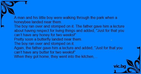 The boy ran over and stomped on it. The father gave him a lecture about having respect for living things and added, "Just for that you can’t have any honey for two weeks!"