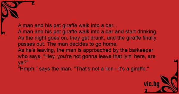 A man and his pet giraffe walk into a bar and start drinking. As the night goes on, they get drunк, and the giraffe finally passes out. The man decides to go home.
