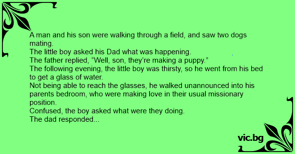 A boy watches his mum and dad having s*x he ask, "What are you doing ?" His dad replies, "Making you a brother or sister!" Boy say, "Do her d*ggy style I want a puppy."