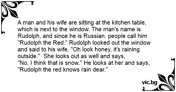 A man and his wife are sitting at the kitchen table, which is next to the window. The man's name is Rudolph, and since he is Russian, people call him "Rudolph the Red." Rudolph looked out the window and said to his wife, "Oh look honey, it's raining outside." She looks out as well and says,