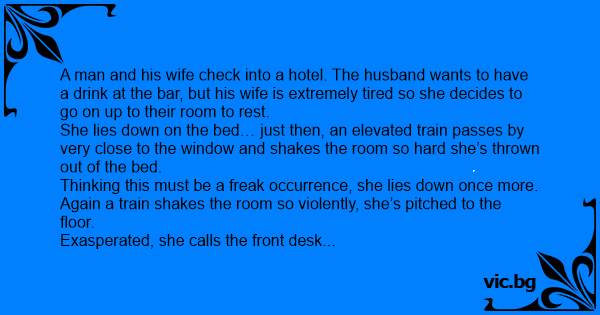 A man and his wife check into a hotel. The husband wants to have a drink at the bar, but his wife is extremely tired so she decides to go on up to their room to rest.