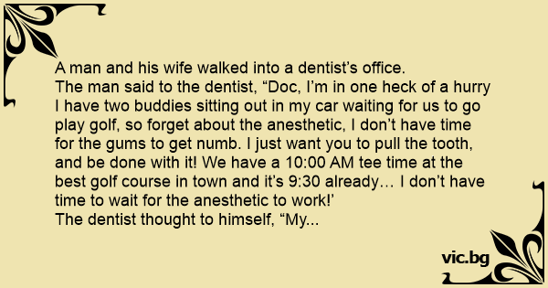 The man said to the dentist, “Doc, I’m in one heck of a hurry I have two buddies sitting out in my car waiting for us to go play golf, so forget about the anesthetic, I don’t have time for the gums to get numb. I just want you to pull the tooth, and be done with it! We have a 10:00 AM tee time at the best golf course in town and it’s 9:30 already… I don’t have time to wait for the anesthetic to work!’