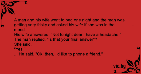 A man and his wife went to bed one night and the man was getting very frisky and asked his wife if she was in the mood.