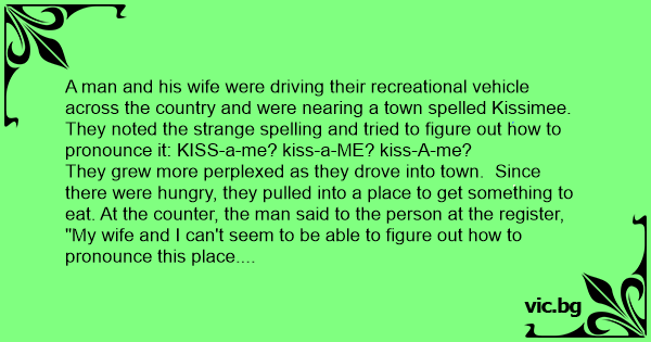A man and his wife were driving their recreational vehicle across the country and were nearing a town spelled Kissimee. They noted the strange spelling and tried to figure out how to pronounce it: KISS-a-me? kiss-a-ME? kiss-A-me?