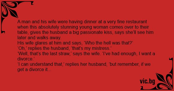 ‘Well, that’s the last straw,’ says the wife. ‘I’ve had enough, I want a divorce.’