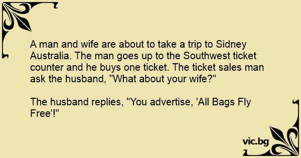 A man and wife are about to take a trip to Sidney Australia. The man goes up to the Southwest ticket counter and he buys one ticket. The ticket sales man ask the husband, "What about your wife?"