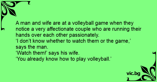 A man and wife are at a volleyball game when they notice a very affectionate couple who are running their hands over each other passionately.