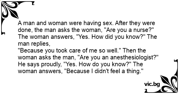 "Because you took care of me so well." Then the woman asks the man, "Are you an anesthesiologist?" He says proudly, "Yes. How do you know?" The woman answers, "Because I didn't feel a thing."