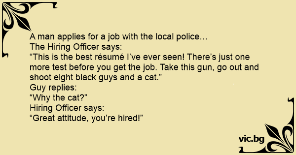 “This is the best résumé I’ve ever seen! There’s just one more test before you get the job. Take this gun, go out and shoot eight black guys and a cat.”
