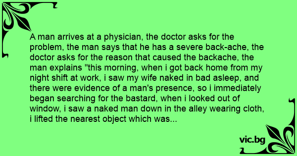 A man arrives at a physician, the doctor asks for the problem, the man says that he has a severe back-ache, the doctor asks for the reason that caused the backache, the man explains "this morning, when i got back home from my night shift at work, i saw my wife nакеd in bad asleep, and there were evidence of a man's presence, so i immediately began searching for the ваsтаrd, when i looked out of window, i saw a nакеd man down in the alley wearing cloth, i lifted the nearest object which was the refrigerator and dropped it out in the alley and it landed on man in the alley. the reason was the lifting". the doctor were shocked and then wrote some drugs in the prescription and the first man leaves. the second man arrives at the physician. doctor asks for the problem and gets "severe back-ache" again, when asks for reason behind it, hears "this morning i woke up late and were very late for work, so i decided to wear my cloth on the way, so i ran to the alley nакеd and began to wear my cloth there when suddenly a heavy object was dropped on me, i guess the reason was being hit by that object."; the doctor was shocked even more, and then wrote some drugs for him. the third man enters and complains about same problem "severe back-ache", the doctor which was shocked to the very existence, sarcastically told the man "did u lift a refrigerator or got hit by a refrigerator?", the man replied "No, i was inside the refrigerator"