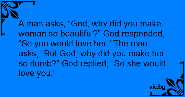 A man asks, “God, why did you make woman so beautiful?” God responded, ”So you would love her.” The man asks, “But God, why did you make her so dumb?” God replied, “So she would love you.”