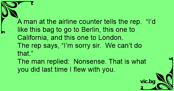 A man at the airline counter tells the rep. “I’d like this bag to go to Berlin, this one to California, and this one to London.