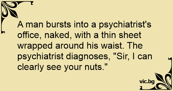 A man bursts into a psychiatrist's office, nакеd, with a thin sheet wrapped around his waist. The psychiatrist diagnoses, "Sir, I can clearly see your nuts."