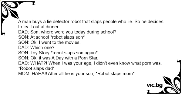 Pappan köper en robot med lögndetektor som slår människor när de ljuger. Han bestämmer sig för att testa den vid middagen. – Son var var du idag? – I skolan pappa. Roboten slår sonen. – Ok, jag såg...
