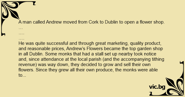 He was quite successful and through great marketing, quality product, and reasonable prices, Andrew’s Flowers became the top garden shop in all Dublin. Some monks that had a stall set up nearby took notice and, since attendance at the local parish (and the accompanying tithing revenue) was way down, they decided to grow and sell their own flowers. Since they grew all their own produce, the monks were able to undercut Andrew at every turn and within 3 months, the monks had stolen nearly all his business. Afraid, running out of money, and growing desperate, Andrew hired local hard man Hugh McTaggart to go to the monks’ stall under cover of darkness and destroy it. Then he was to go to their garden and use an herbicide on every bloom and blossom.