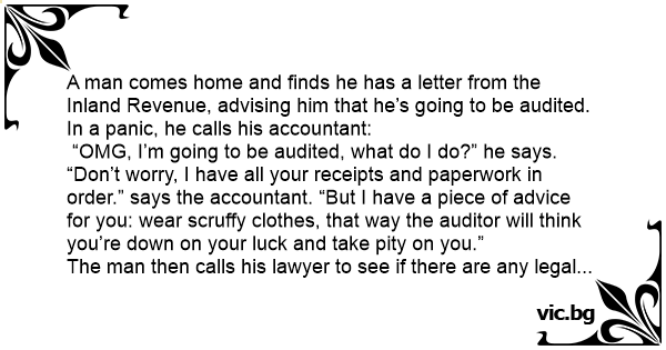A man comes home and finds he has a letter from the Inland Revenue, advising him that he’s going to be audited. In a panic, he calls his accountant: