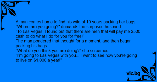Γυρίζοντας κατάκοπος ο σύζυγος στο σπίτι του, βλέπει την γυναίκα του να φτιάχνει την βαλίτσα της. - Που πας; την ρωτάει. - Πάω στο Λας Βέγκας, για ένα χρόνο, έμαθα ότι εκεί οι πόρνες, παίρνουν 400$...