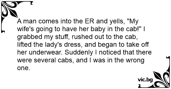 A man comes into the ER and yells, "My wife's going to have her baby in the cab!" I grabbed my stuff, rushed out to the cab, lifted the lady's dress, and began to take off her underwear. Suddenly I noticed that there were several cabs, and I was in the wrong one.