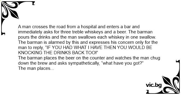 A man crosses the road from a hospital and enters a bar and immediately asks for three treble whiskeys and a вееr. The barman pours the drinks and the man swallows each whiskey in one swallow.