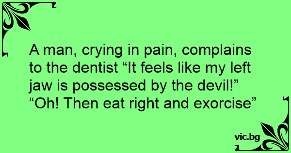 A man, crying in pain, complains to the dentist “It feels like my left jaw is possessed by the devil!”