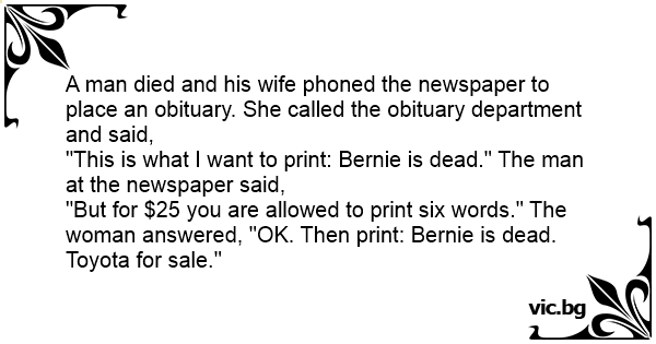 "But for $25 you are allowed to print six words." The woman answered, "OK. Then print: Bernie is dead. Toyota for sale."