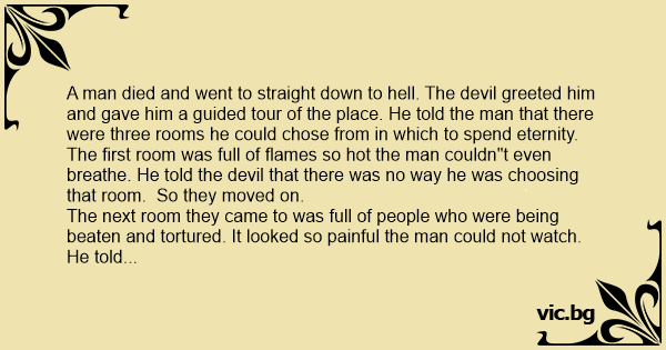 A man died and went to straight down to hеll. The devil greeted him and gave him a guided tour of the place. He told the man that there were three rooms he could chose from in which to spend eternity.